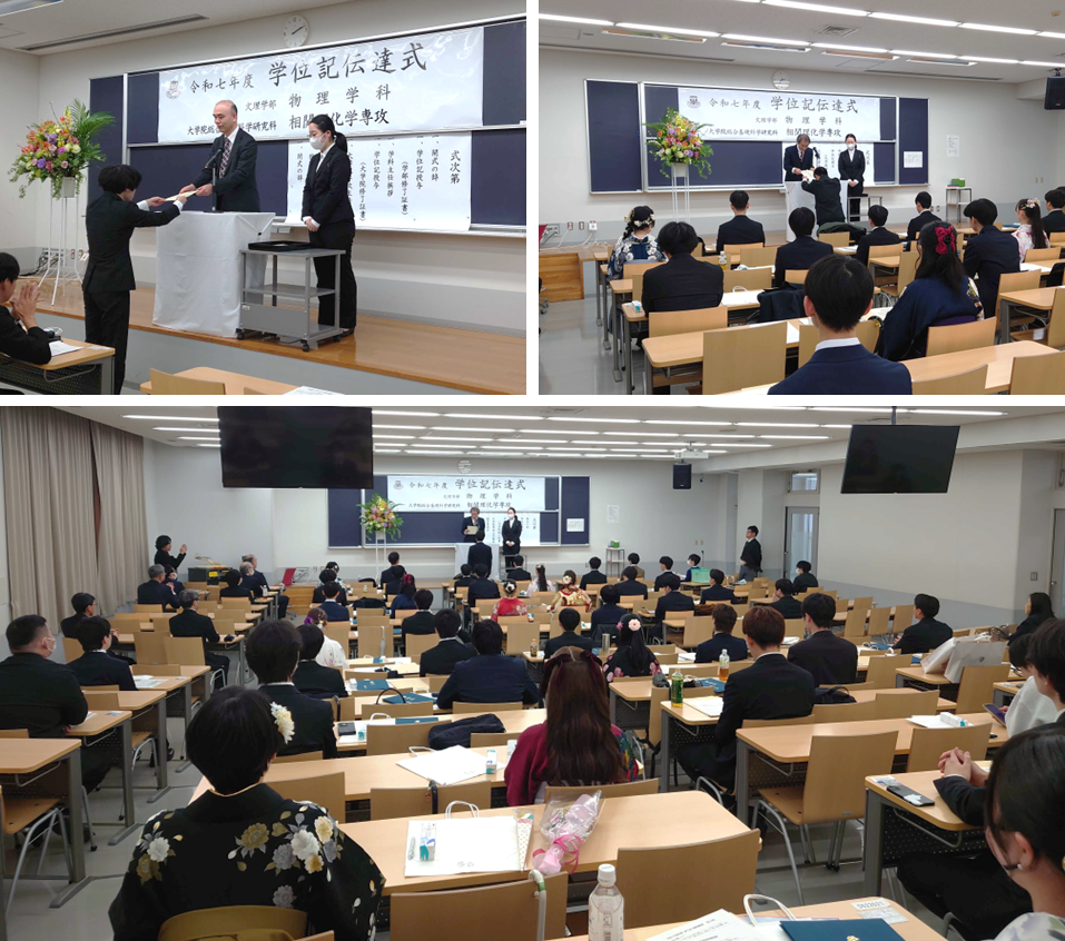 全ての記事 お知らせ 受験生 イベント 研究関連 在学生 全ての記事 お知らせ 受験生 イベント 研究関連 在学生 イベント 2026年03月25日 令和7年度卒業式および学位記伝達式が挙行されました。 本日午前に、日本武道館で卒業式が挙行されました。 午後には、文理学部キャンパスの3号館で物理学科、および大学院相関理化学専攻の学位記伝達式が執り行われました。学部卒業生45名、博士前期課程修了者5名にそれぞれ学位記が授与されました。 皆さん、御卒業おめでとうございます。今後のご活躍を願っております。 このページを閉じる 記事の一覧